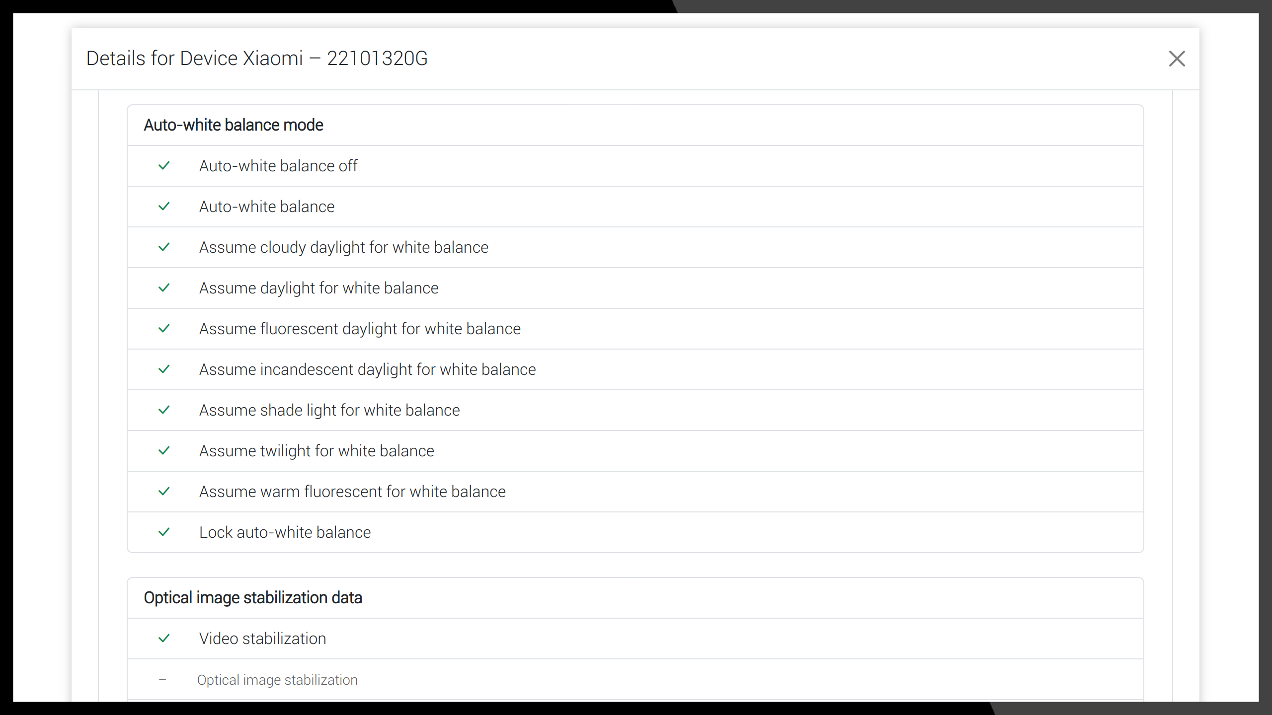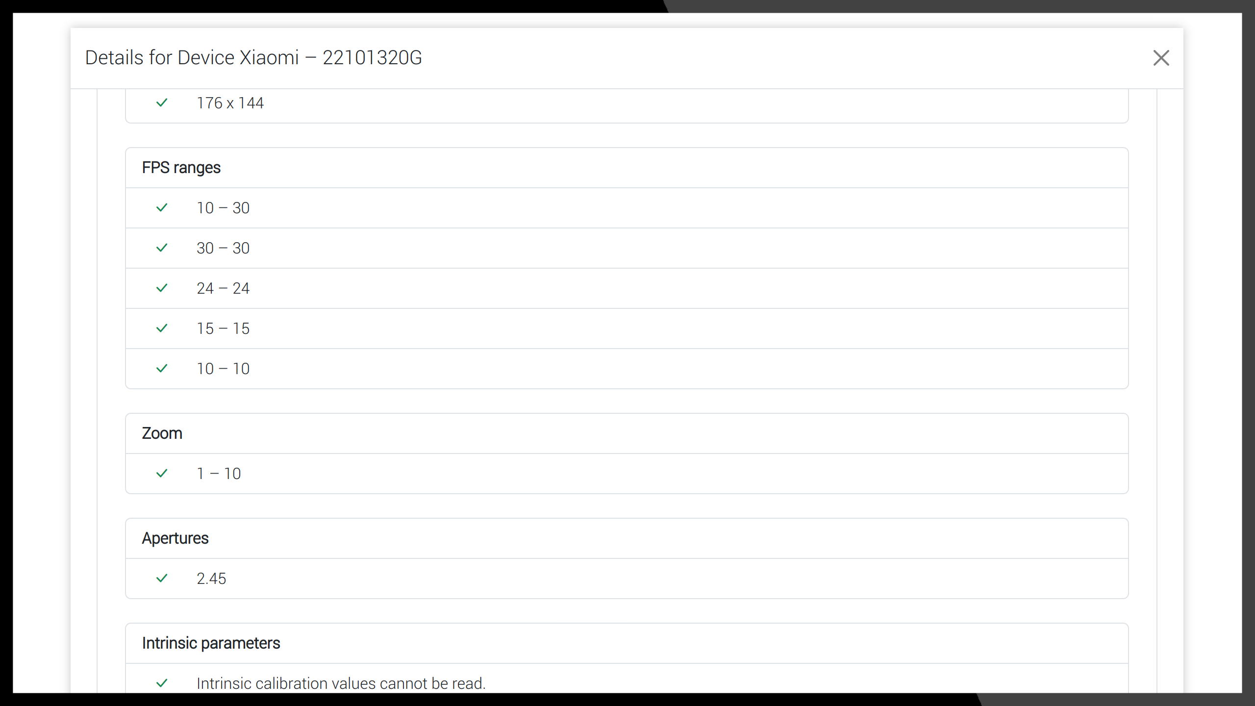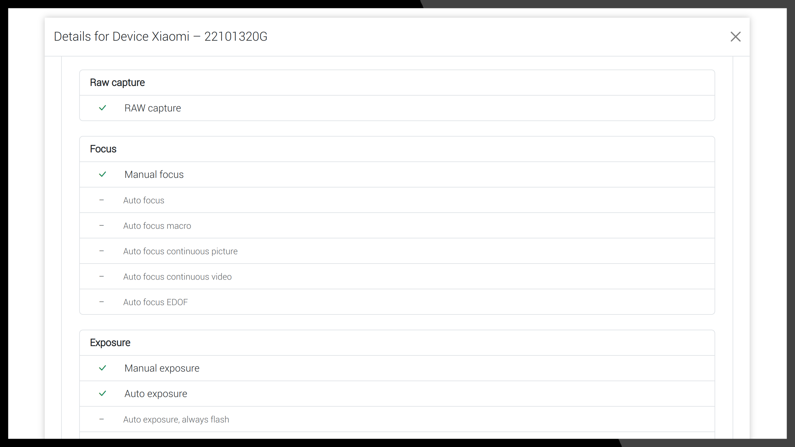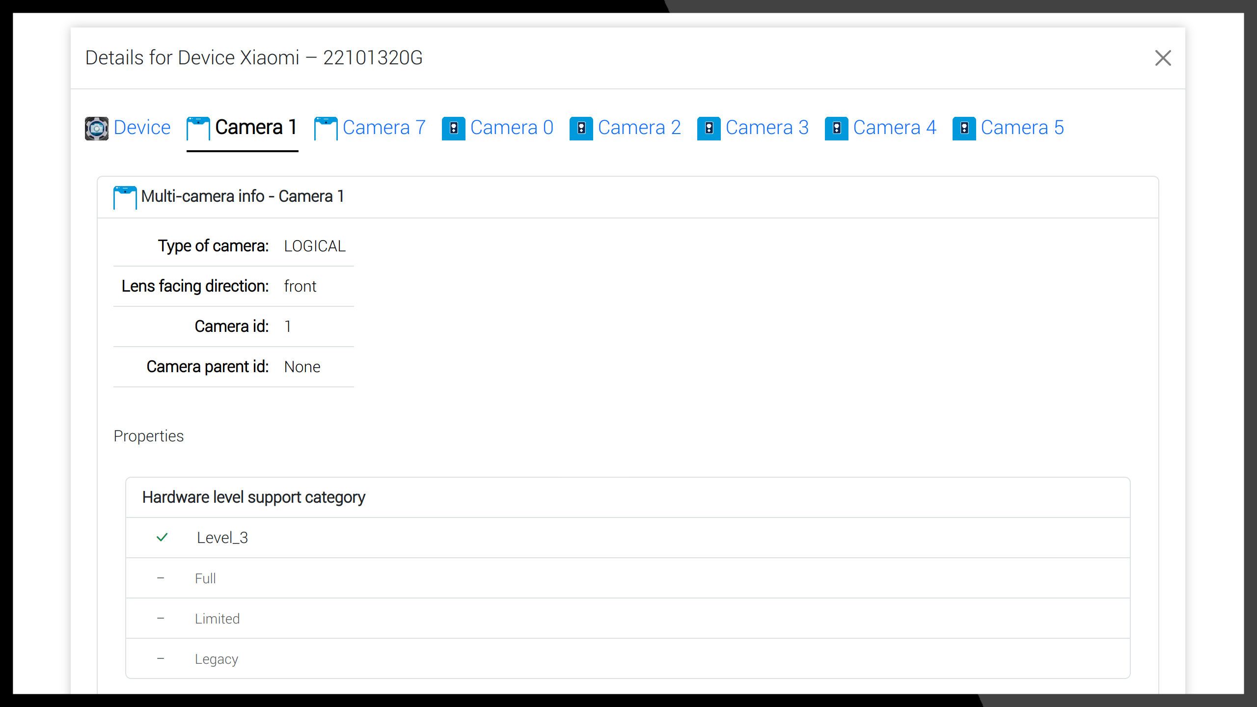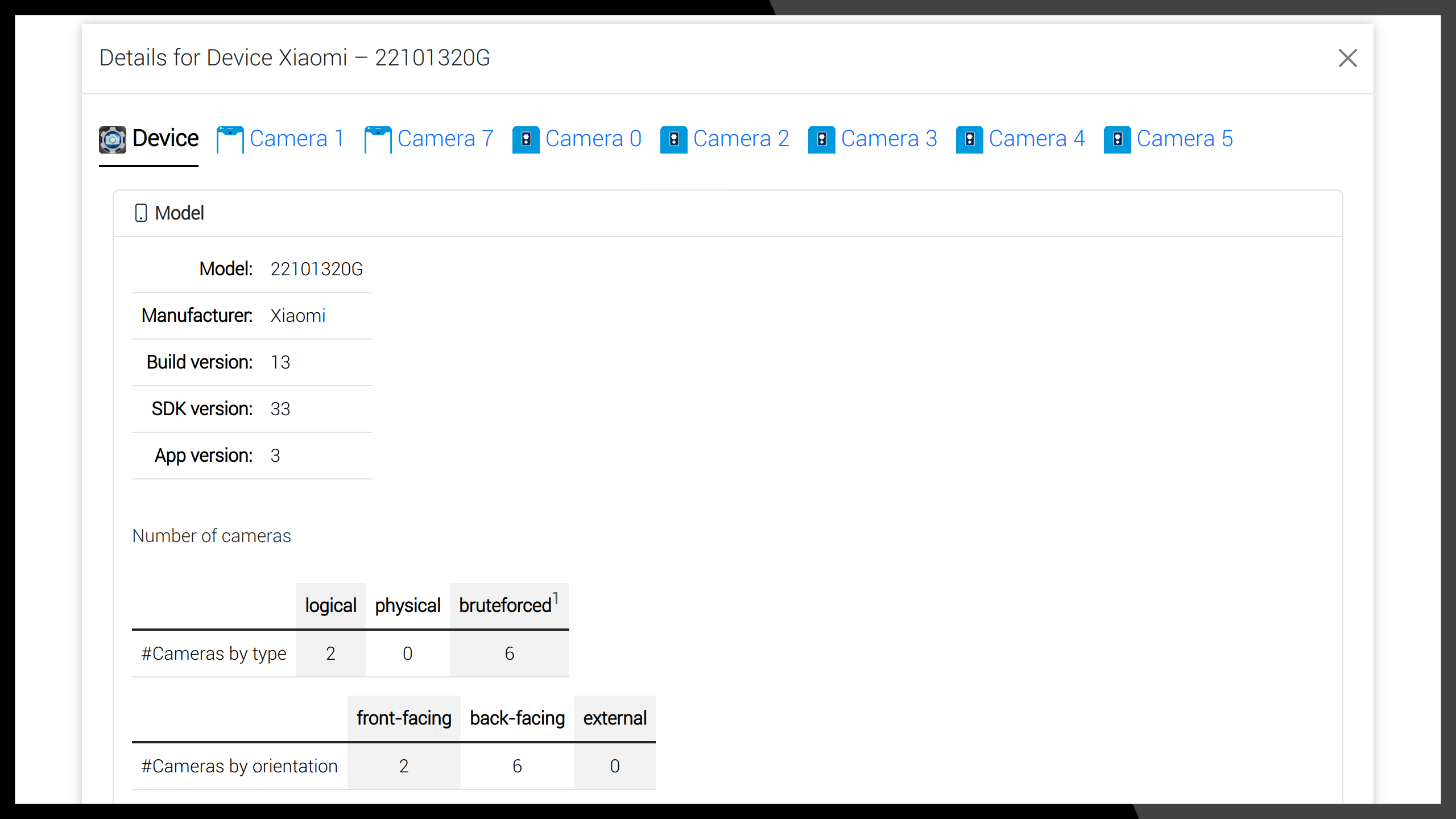 For every camera (back-/front-facing) detected on your device, you can find out the